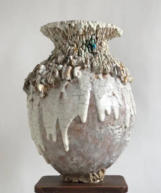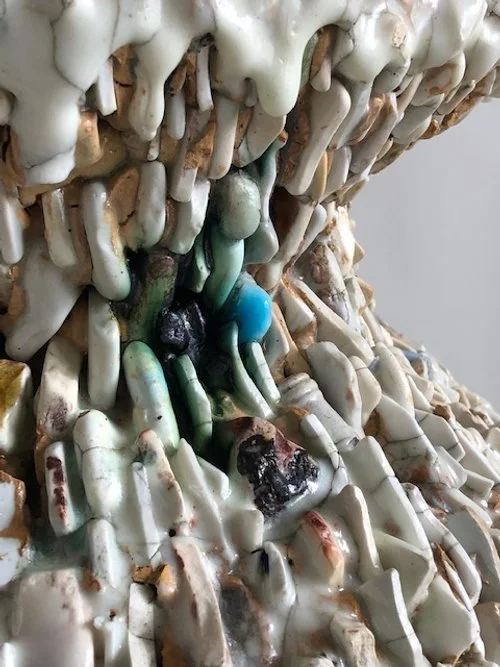 Old ceramic shards of varied origins are gathered from the Wellington coastline and incorporated into a new ceramic form.